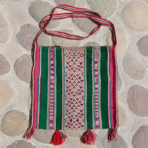 Beautiful, finely, handwoven bag of alpaca wool with intricate diamond patterns in green and magenta / plum.