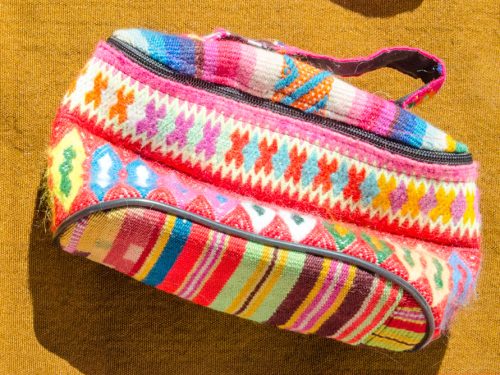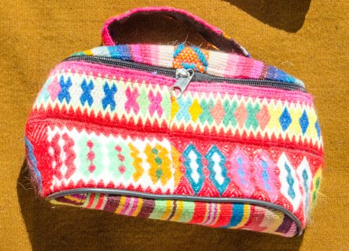 Super colorful bag with handle and flat bottom. Has a full zipper around the top and inside lining. Full of geometric Inka patterns. Practical and beautiful!