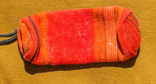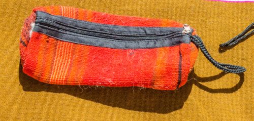 Small round zipper bag in red. Fully lined. Has a zipper closure at the top. This type of bag is perfect for holding art and school supplies, such as pens.