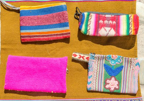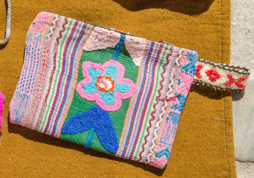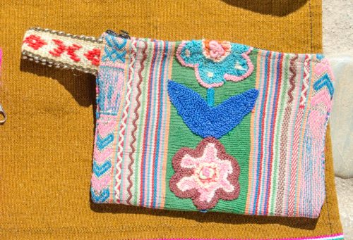 Small zipper bag created from an old lliclia in soft green with thin stripes of pink, blue, brown, red, orange and white. Fully lined. Has embroidered flowers on both sides. Unique and very pretty!