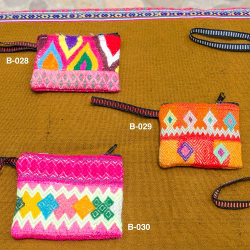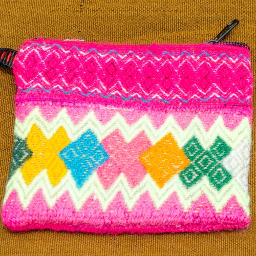 Small Handwoven Purse with zipper in magenta with diamond patterns.