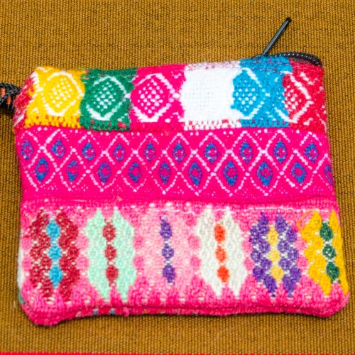 Small handwoven purse with zipper in magenta with various designs.