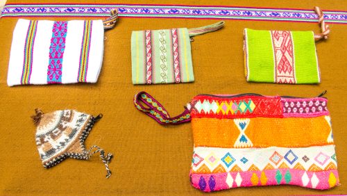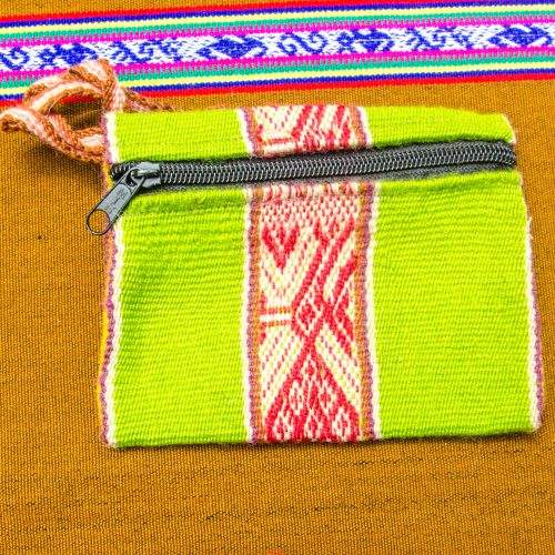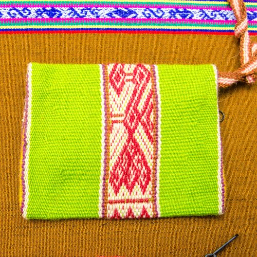 Beautiful, small bag with a zipper closure by Pedro’s wife Cecilia from the high Andean community of Yanamayu. The bag is a fresh green with red and natural geometric bird designs down the center. Very well made. Strong and simple!