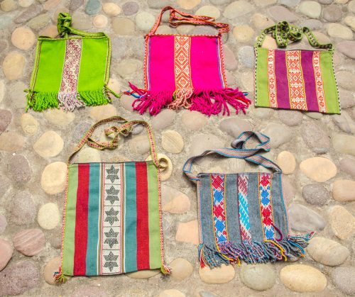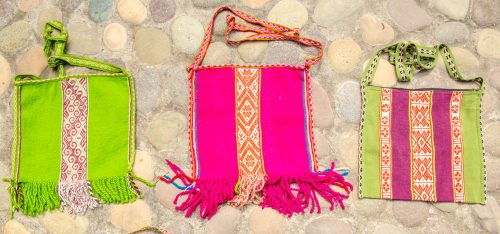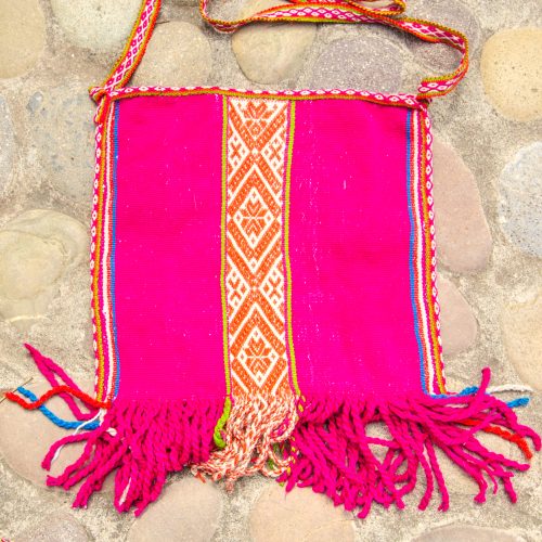 Super beautiful shoulder bag in magenta with a central band of geometric designs in soft red and natural. Handmade by Cecilia in the high Andean community of Yanamayu. The bag is edge with diamond designs in magenta. Simple and gorgeous!
