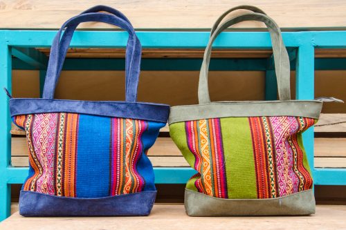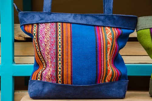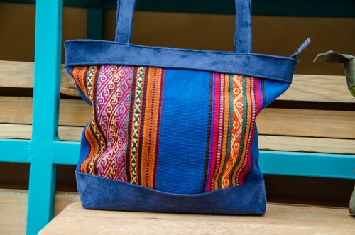 Very fine quality, shoulder bag made by Maquisha Art in the Sacred Valley. Has a blue suede trim. (It looks like real leather, but they assured me that it isn’t.) There is a gorgeous textile on the main part of the purse with a blue background and geometric designs in oranges, greens, magenta, red, blues and natural. The purse is fully lined and has an inside pocket.