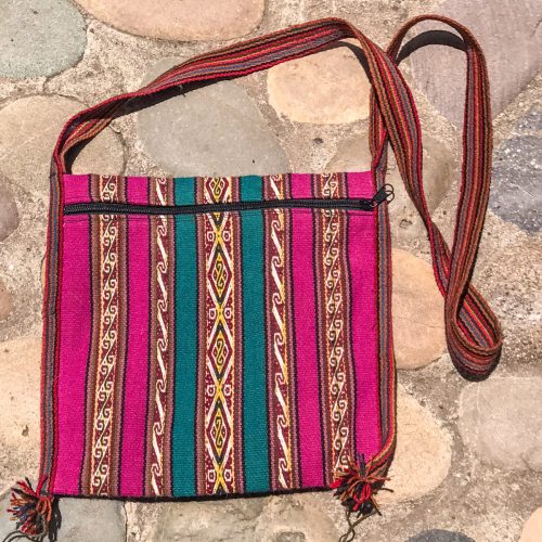 Beautiful bag in magenta and green with geometric designs from the village of Chinchero. Has a zipper closure.