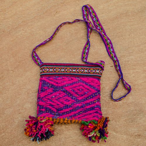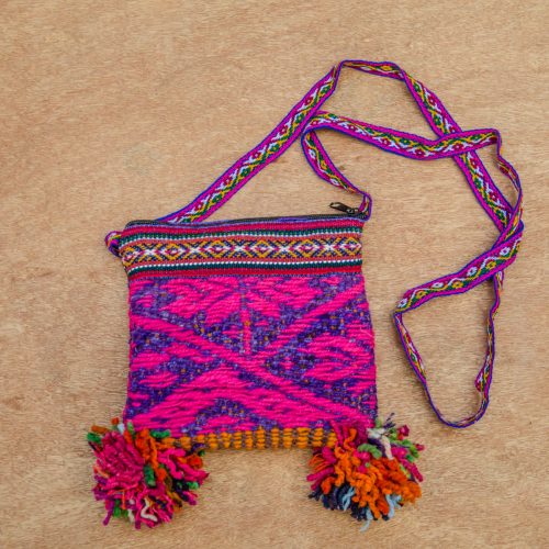Very beautiful, small bag with zipper, pompoms and a shoulder strap. In magenta and purple, with a bit of orange on the bottom.