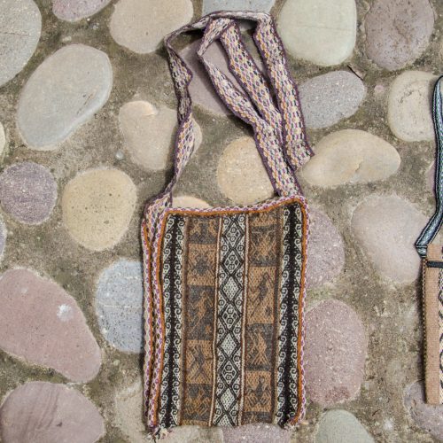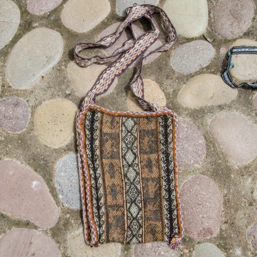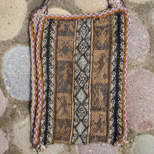 A finely woven chuspa bag in a natural alpaca colors. Has stylized geometric and animal designs. This is from one of the remote Andean communities in the mountains above our village that can only be reached by walking.