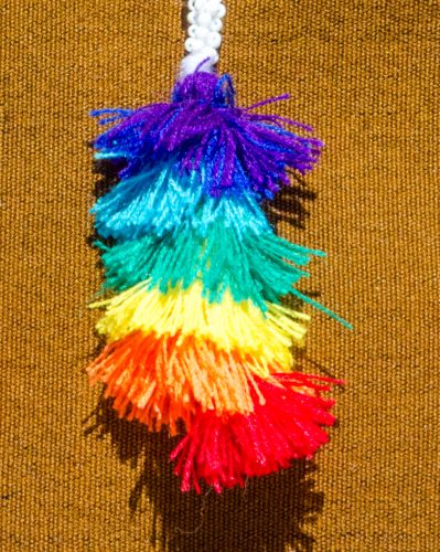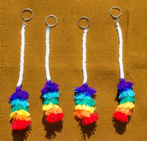 Long beaded keyrings made by the Q’eros. There are bright rainbow colored tassels at the bottom which make it practically impossible to lose your keys!