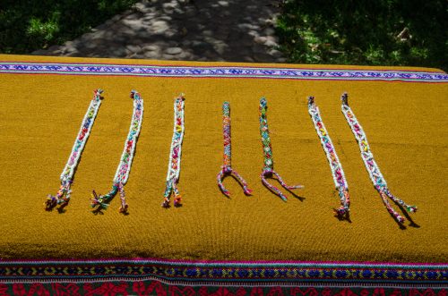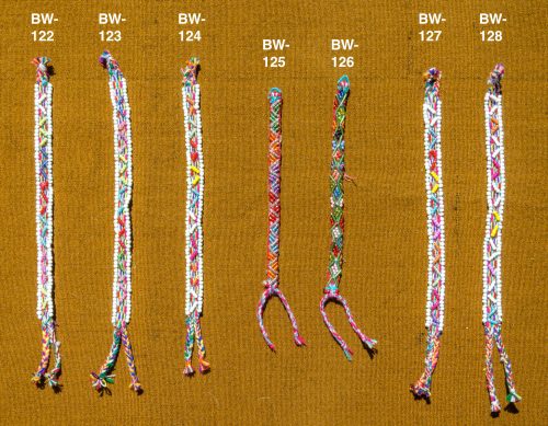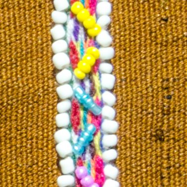 Handwoven Q’ero bracelet edged in white beads with multi-colored beadwork in the middle.