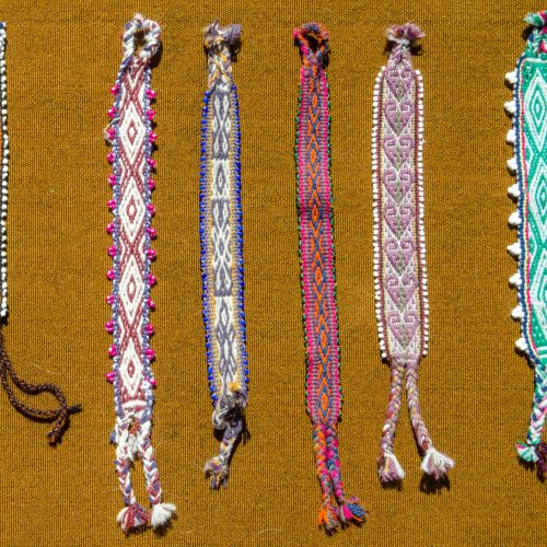 Finely woven bracelet in red, natural and black with magenta bead trim. Double sided with reversed pattern on the other side.
