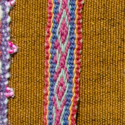 Finely woven, thin bracelet in blues and reds with geometric designs.