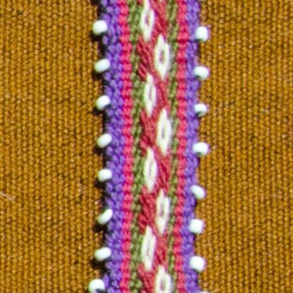 Handwoven bracelet with a diamond pattern in red, white, green and purple. Has a white bead edge. Design is reversed on the opposite side.