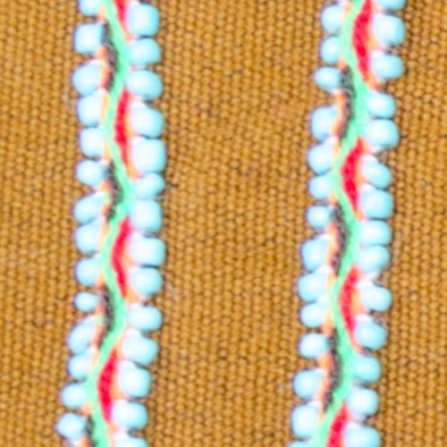 Handwoven Q’ero beaded bracelet in green, orange, red and black with light blue bead trim.