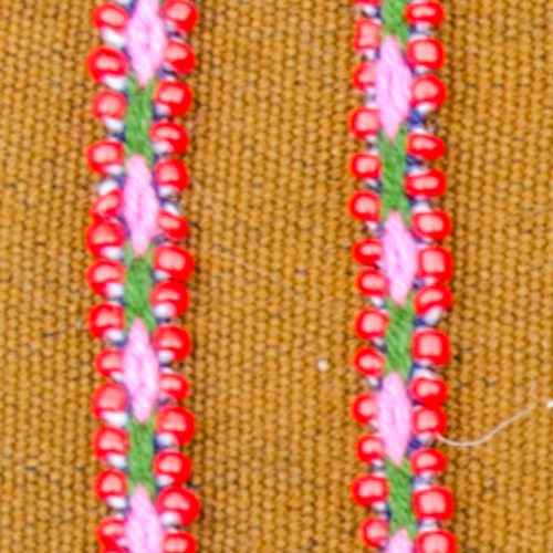 Handwoven Q’ero bracelet in pink and green with red bead edges.