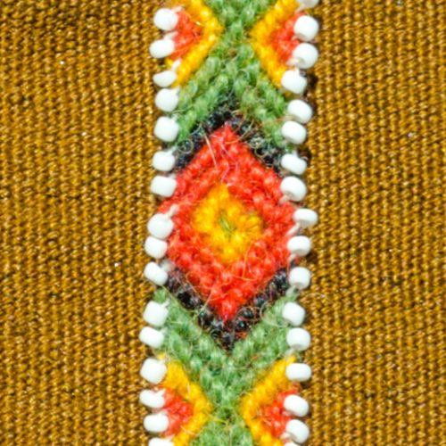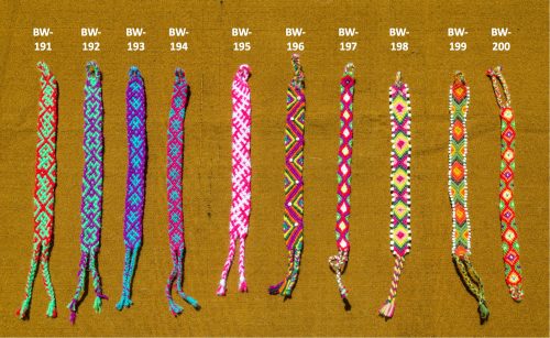 Handknotted bracelet with diamond patterns in greens and oranges with white bead trim. From the remote area of Ankasmarka.