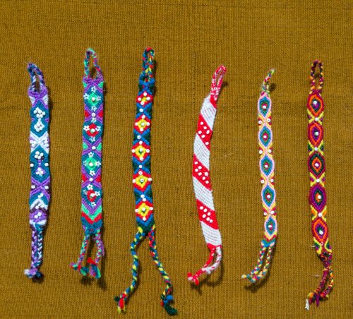 Handwoven bracelet in lavender, dark green and white, in diamond patterns with occasional white beads from the remote area of Ankasmarka.