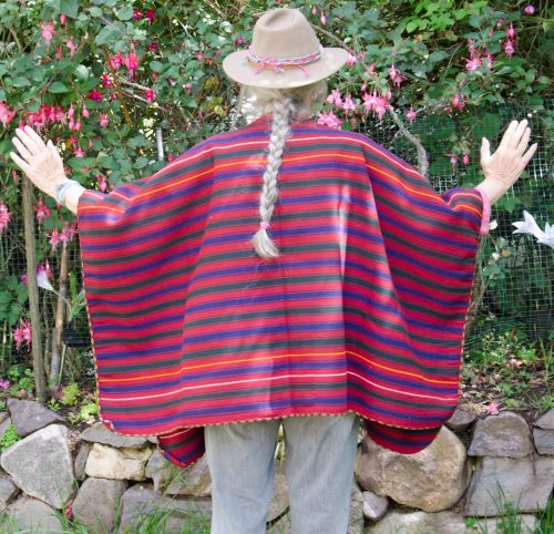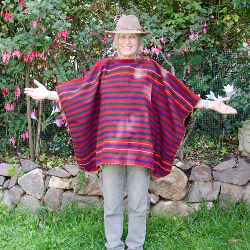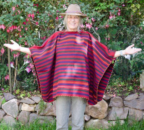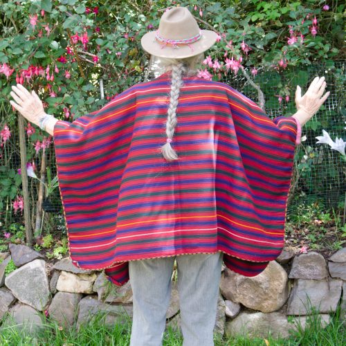 Traditional style Poncho from the weaving village of Chinchero. Has a red background with dark blue and green stripes. Edged with handwoven strip of diamond patterns.