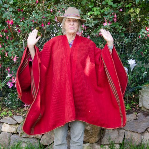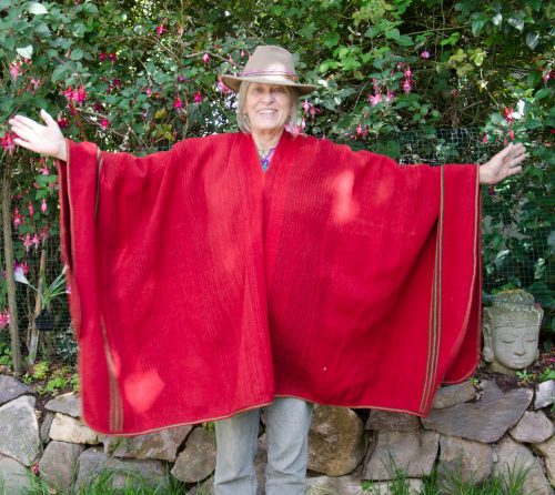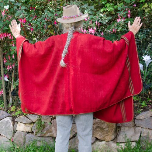 Red Poncho with subtle stripes of the same color. Fully edged with red and green.