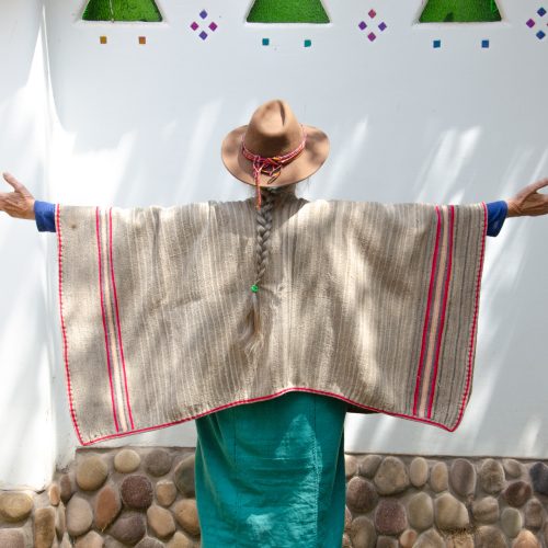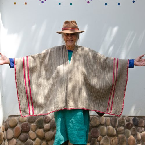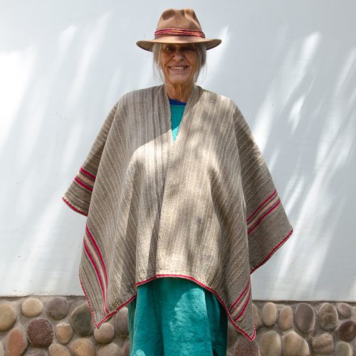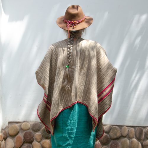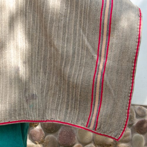 Antique poncho in soft greys with a few thin stripes of magenta. Has a few stains, but is in good condition. The poncho is fully edged in a handwoven strip of grey, magenta and pale pink. Has very good energy!