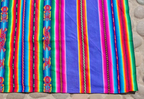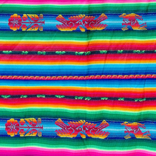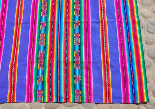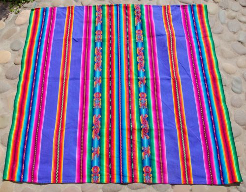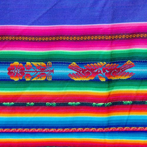Gorgeous large lliclia in a bright purple with rainbow stripes. Has woven motifs of flowers, pairs of love birds and an Inca on a horse. Super luscious and beautiful.