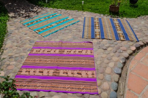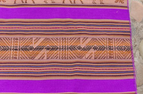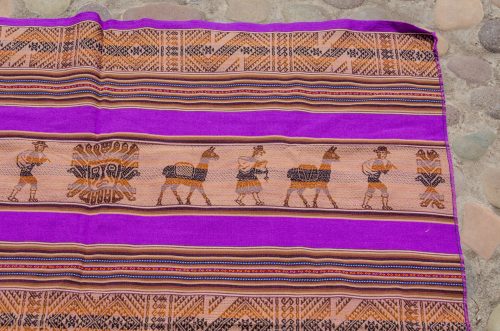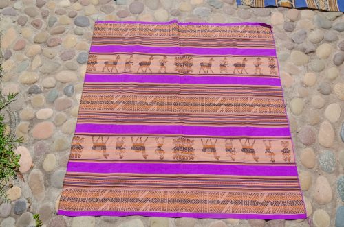 Beautiful soft purple / mauve lliclia with natural colored bands in geometric designs, as well as bands of Inti (the Inca Sun), llamas and people.