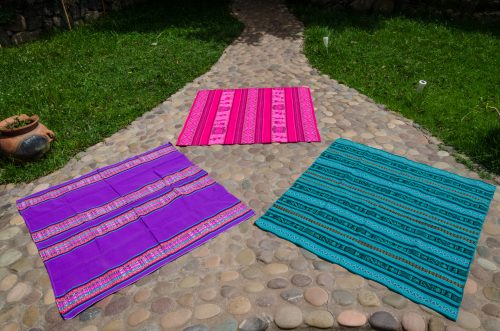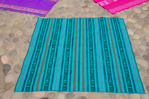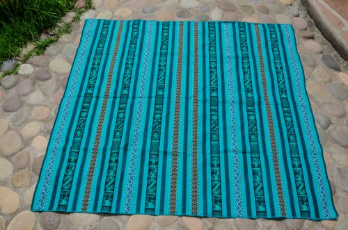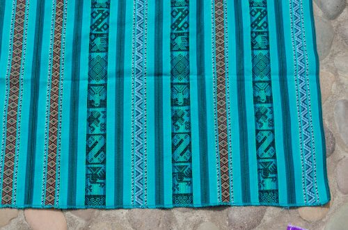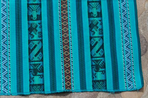 Very pretty lliclia in gorgeous greens with stylized birds and fish and fine stripes on the sides.