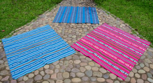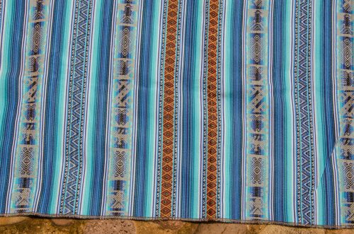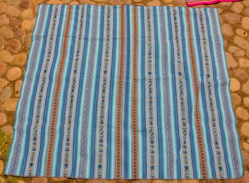 Beautiful lliclia with thin stripes in shades of blue with stylized condor designs.