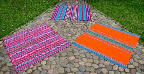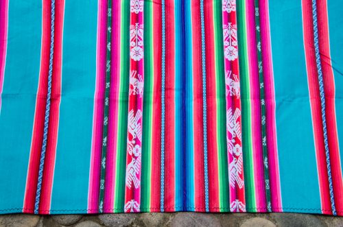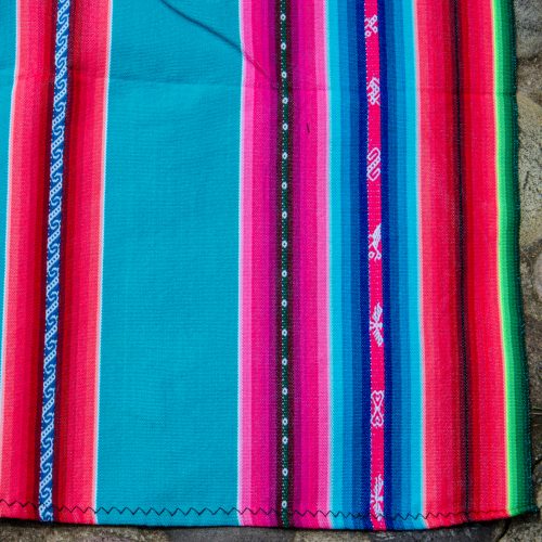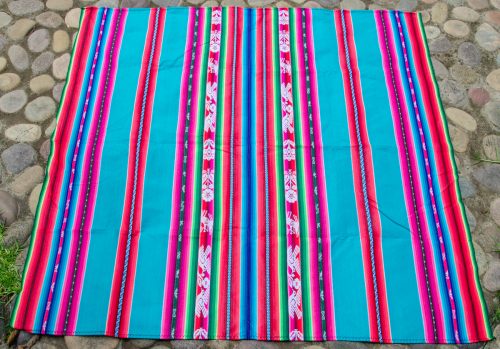 Turquoise Lliclia with Flowers / Birds. Multi-colored stripes of pinks, magenta, orange, reds, greens and blues. (The background color is more of a beautiful green turquoise than in the photos.)