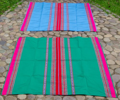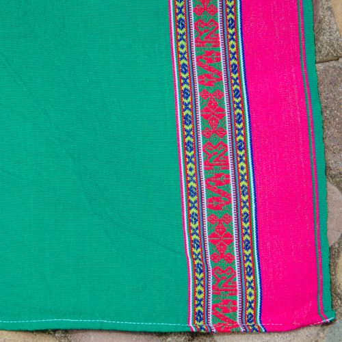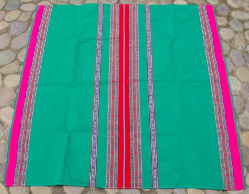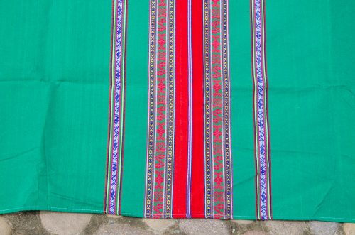 Simple and Elegant Green LLiclia with thin bands of geometric motifs in purple / natural and red / green. Plus small bands of red and magenta.