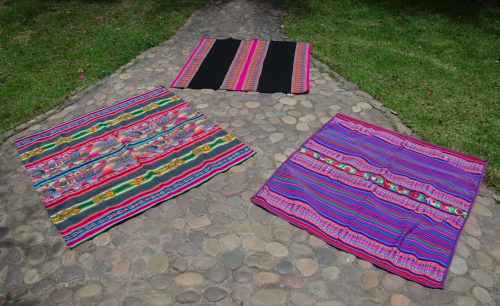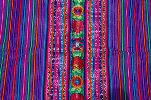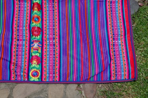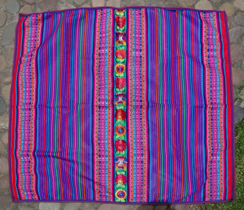 Purple Lliclia with thin stripes of magenta, pnks, blues, greens, reds and white. Has a handwoven edging. In the middle is an embroidered strip of flowers!