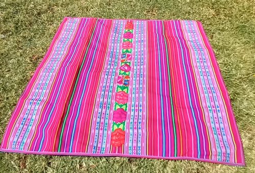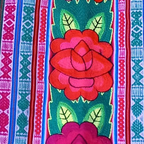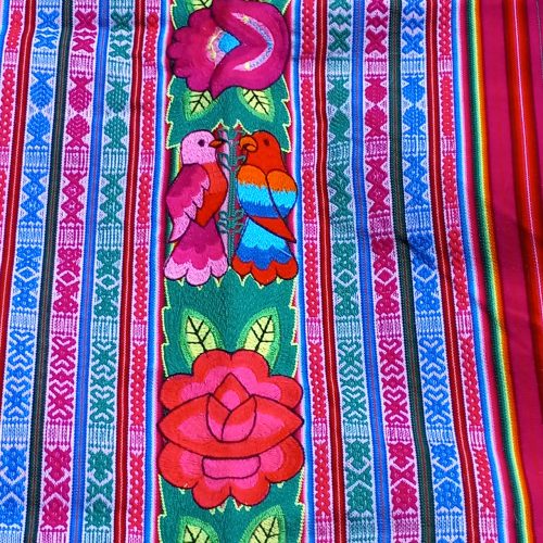Red lliclia with thing multi-colored stripes in pink, blues, greens, purples, oranges and reds. In the middle is an embroidered strip of large flowers and birds.