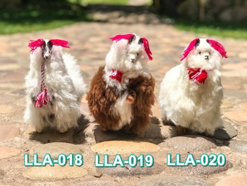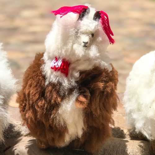 Soft and super fluffy brown Alpaca. Medium size, with a white head and red ear tassels! This one is really adorable!!