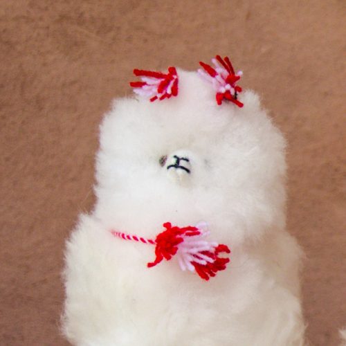 Very fluffy, Alpaca cria in S – M size. Has red and white ear tassels and collar. Handmade by the Q’ero.