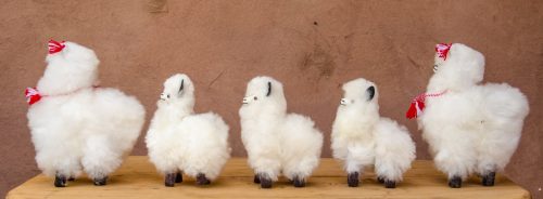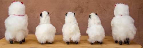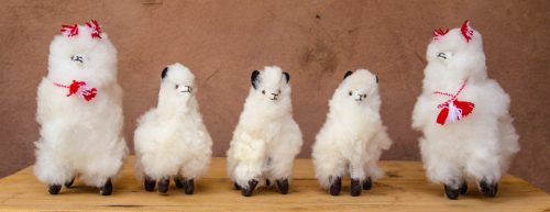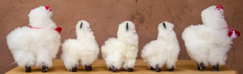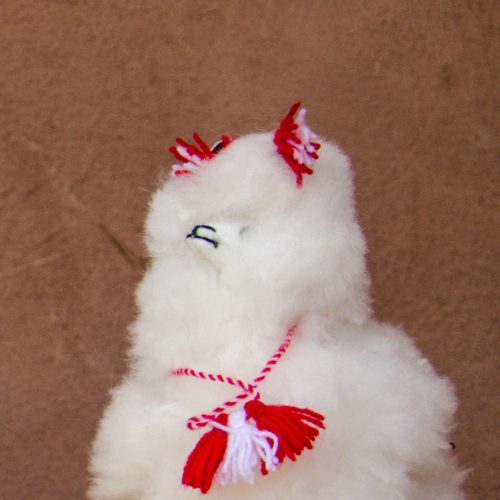 Very fluffy, Alpaca cria in S – M size. Has red and white ear tassels and collar. Handmade by the Q’ero.