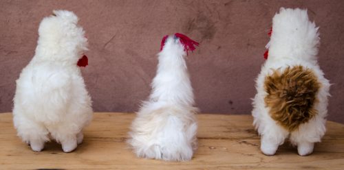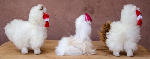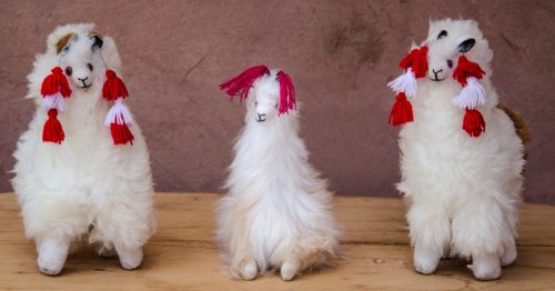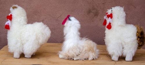 Very fluffy, Alpaca cria in S – M size. Has red and white long ear tassels. Handmade by the Q’ero.