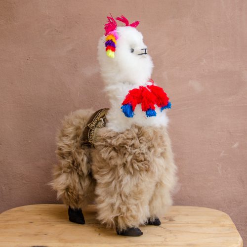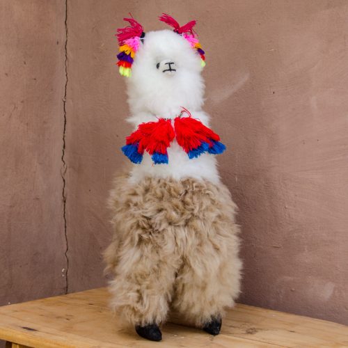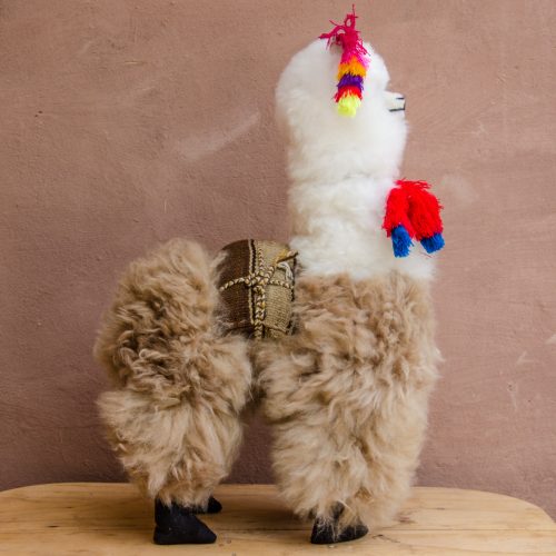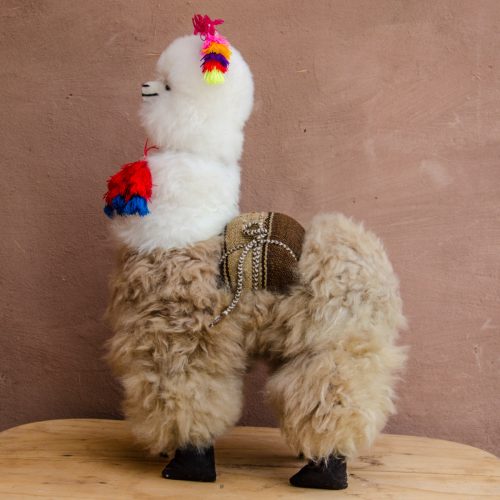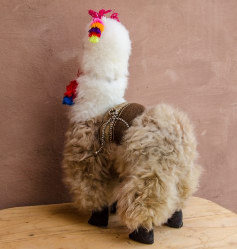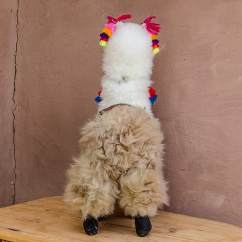 Very soft and fluffy, tan and white, extra large Alpaca. Has multi-colored long ear tassels and pom poms around its neck. Also has a handwoven pack on his back. This alpaca has a very sweet personality. Handmade by the Q’ero.
