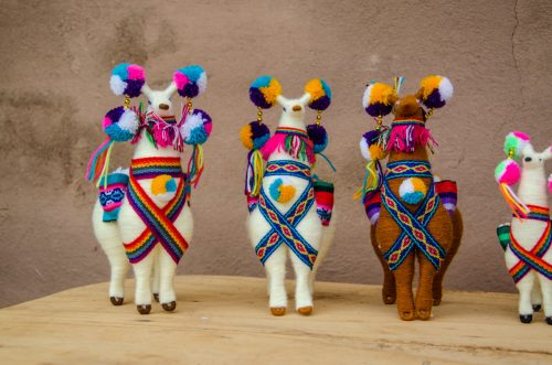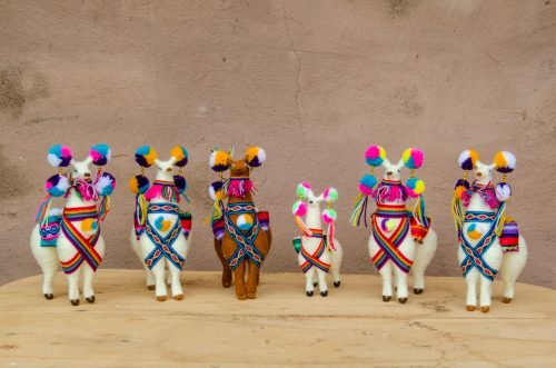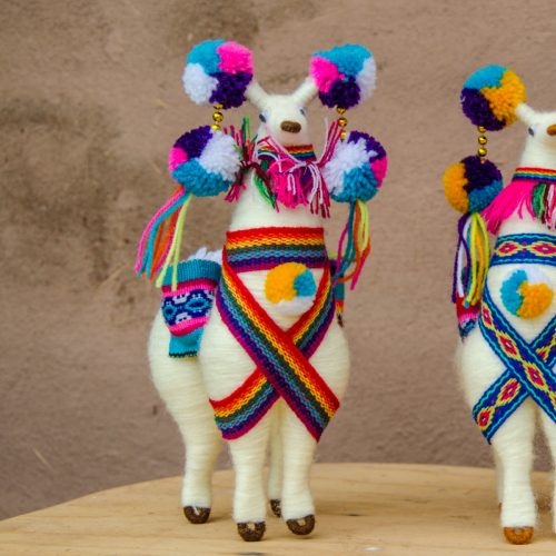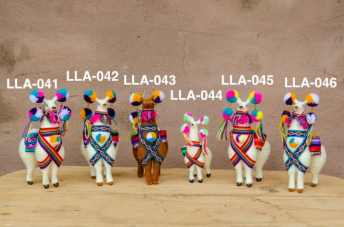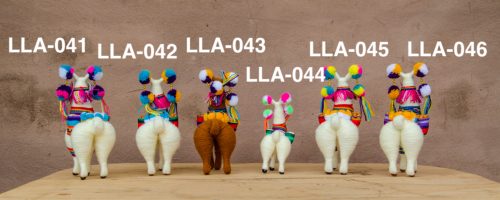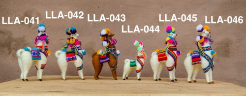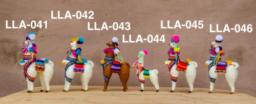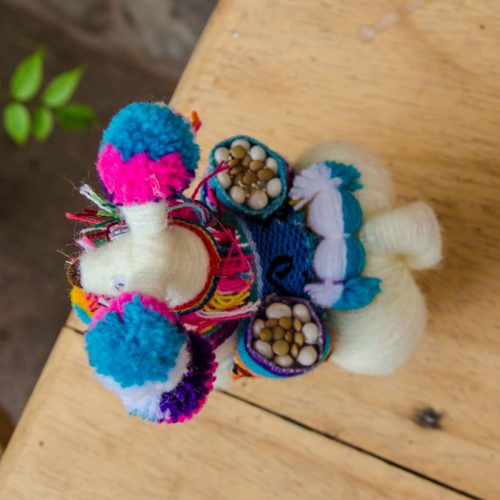 White Llama loaded with bags full of seeds and decorated with pom poms and woven bands. Very festive and happy!