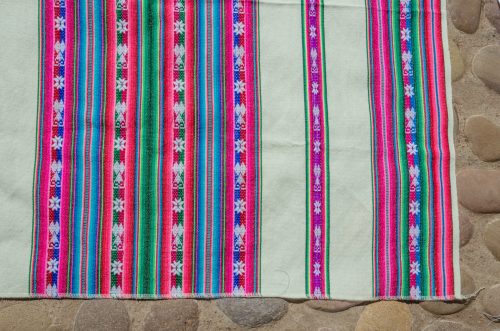 Cream colored, lightweight lliclia with bands of magentas, greens, blue and white. With woven motif of hearts and stars.