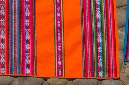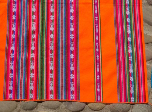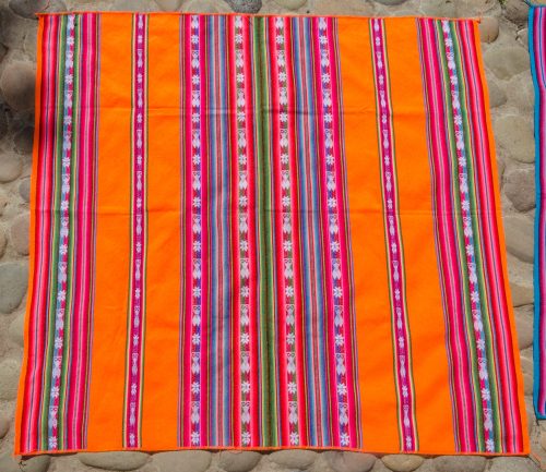 Bright orange lightweight lliclia with woven stripes of magenta, green and blue and bands of hearts and stars. Very happy!