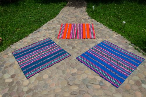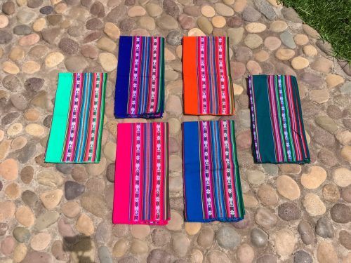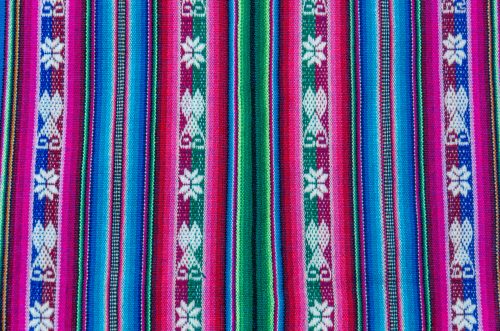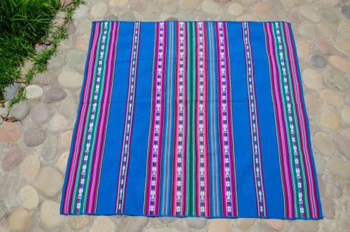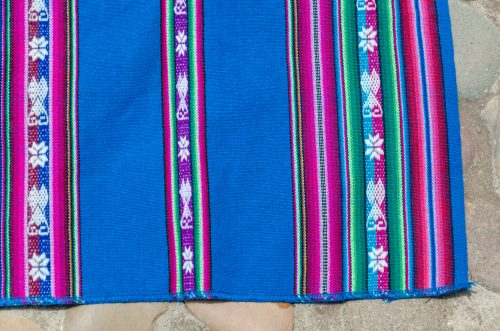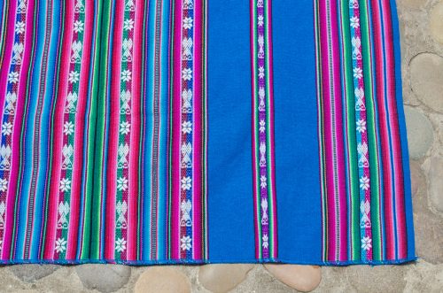 Lightweight lliclia in teal blue with woven stripes of hearts and stars.