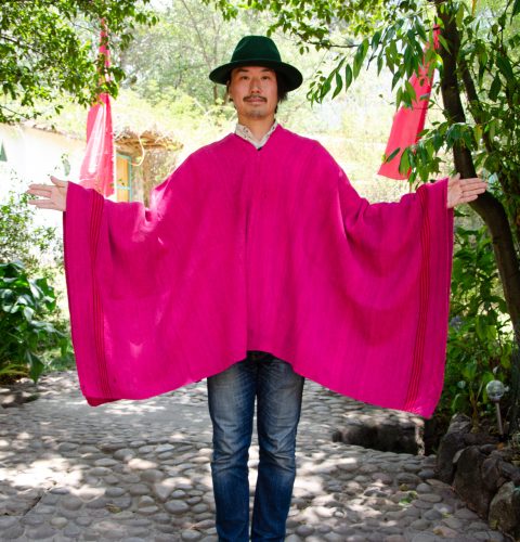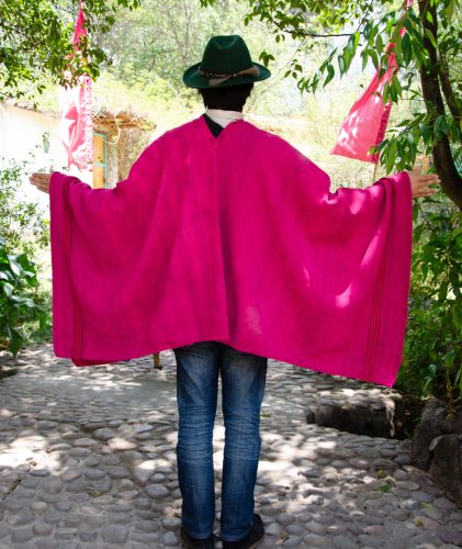 Antique Magenta Poncho with thin stripes of various pinks and magentas. The main part of the poncho is full of subtle shifts of magenta.