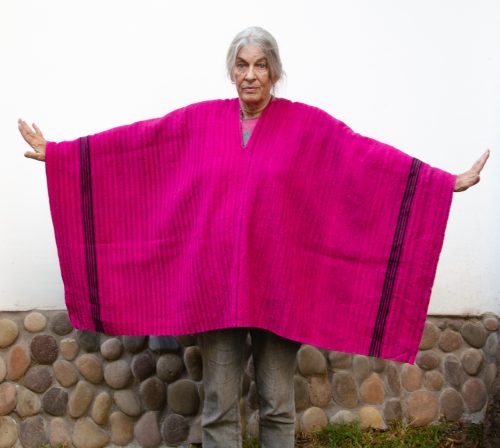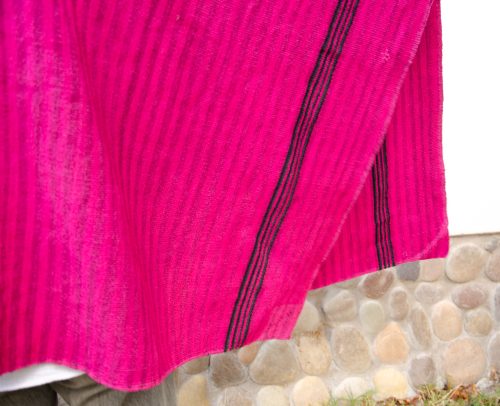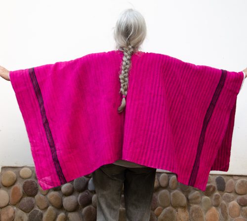 Antique Magenta Poncho with thin magenta stripes and a band of thin green and black stripes.