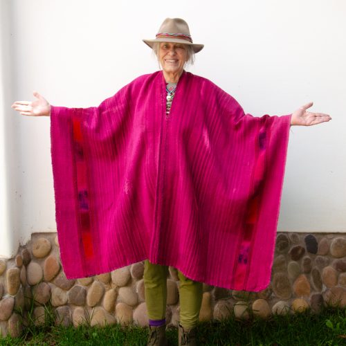 Magenta Poncho with subtle magenta stripes. Has two woven bands of soft red and purple. This antique poncho has a few repairs and a soft energy.