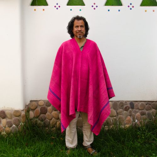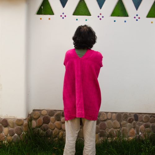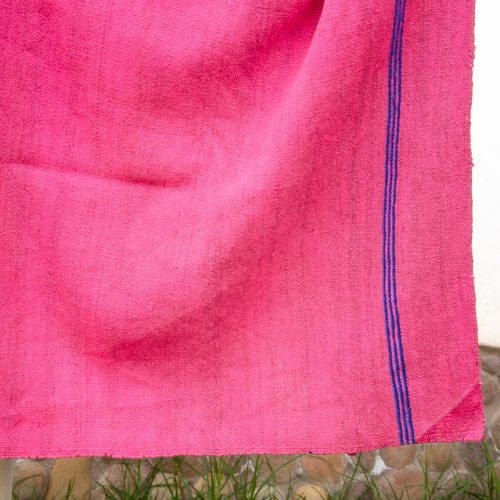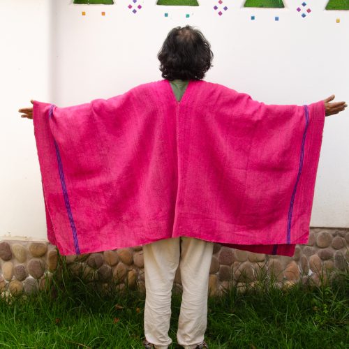 Large Magenta Poncho with three thin blue stripes on each side.
