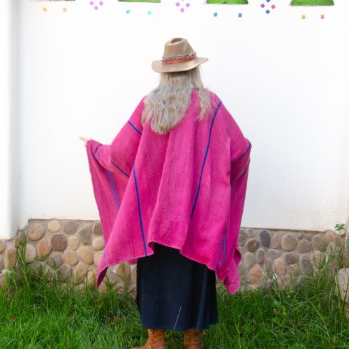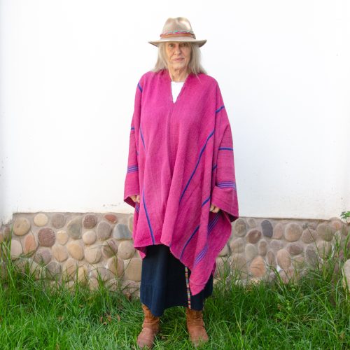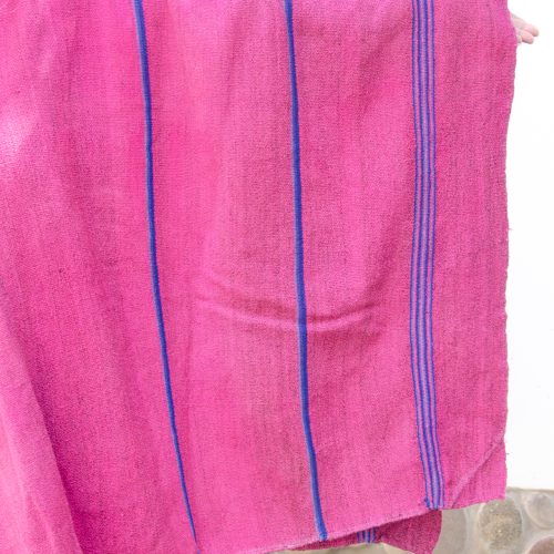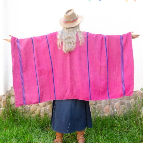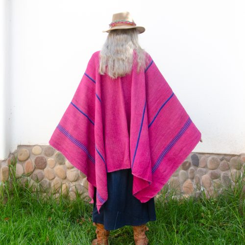 Magenta Poncho with several blue stripes, plus 4 blue thin stripes. Blues are in light and dark shades.