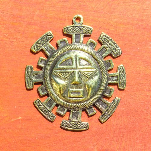 Large Inti Sun made of brass in the traditional Inka Sun design with eight rays.