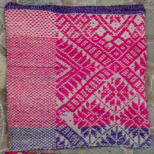 Handwoven pillow cover in magenta and natural in a geometric design. There are narrow strips of purple and natural on two sides.