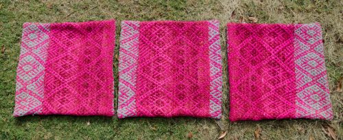 Three Bright Pink / Magenta Pillow Covers with a stripe of light grey / bright pink. The backs are black with zipper closures.