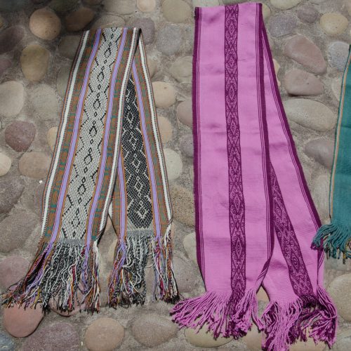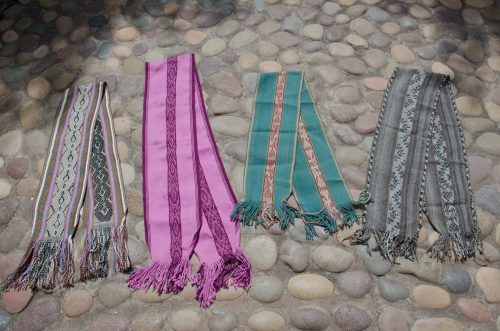 Very pretty and soft, long handwoven scarf in a rose pink with geometric designs in plum. Handwoven of sheep / alpaca wool.